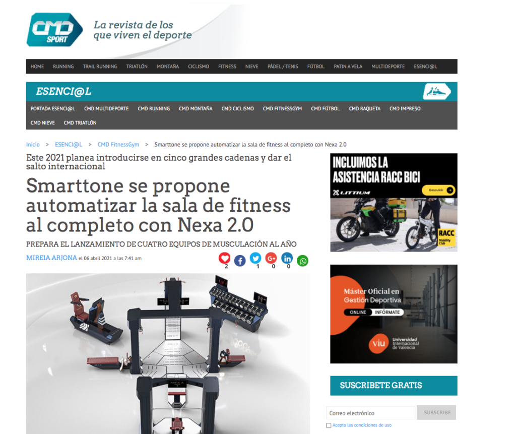 El portal especializado CMD Sport se hace eco de los planes de futuro de Smarttone con la comercialización de Nexa 2.0. En una entrevista al CEO de Smarttone, Juan Pedro Alonso, la publicación avanza cuál es la línea de comercialización prevista para 2021 y repasa la experiencia del circuito Nexa en su primera instalación, el gimnasio alicantino Arena.